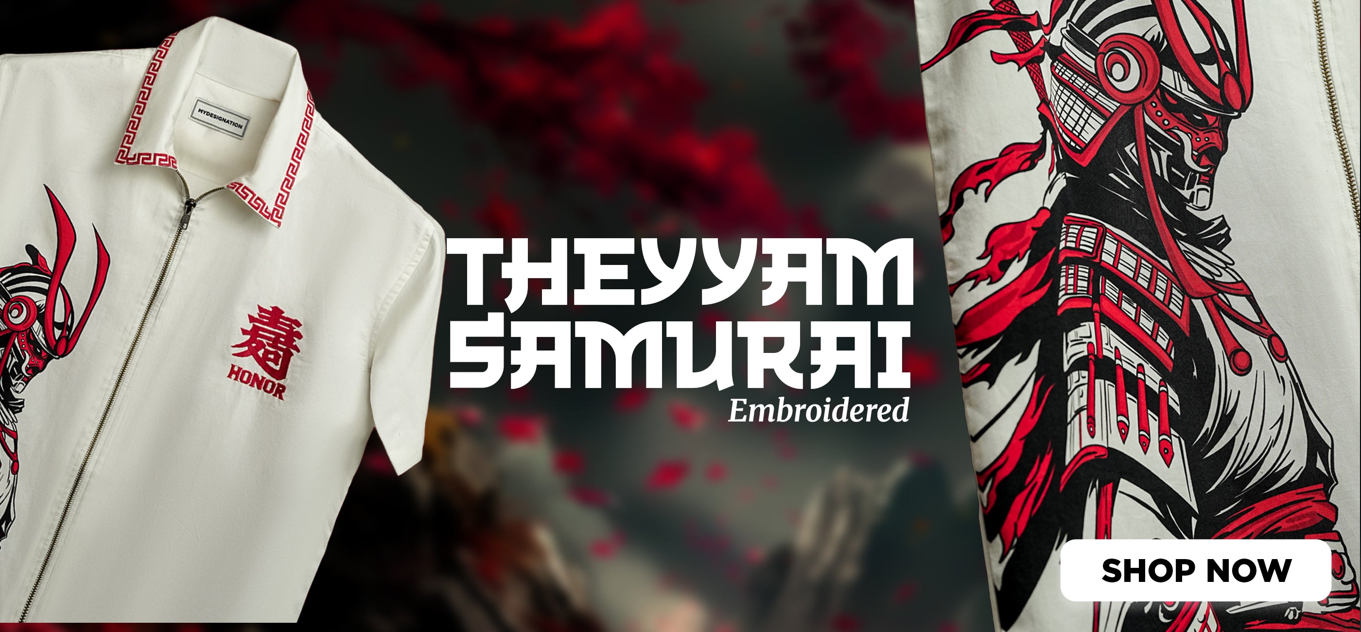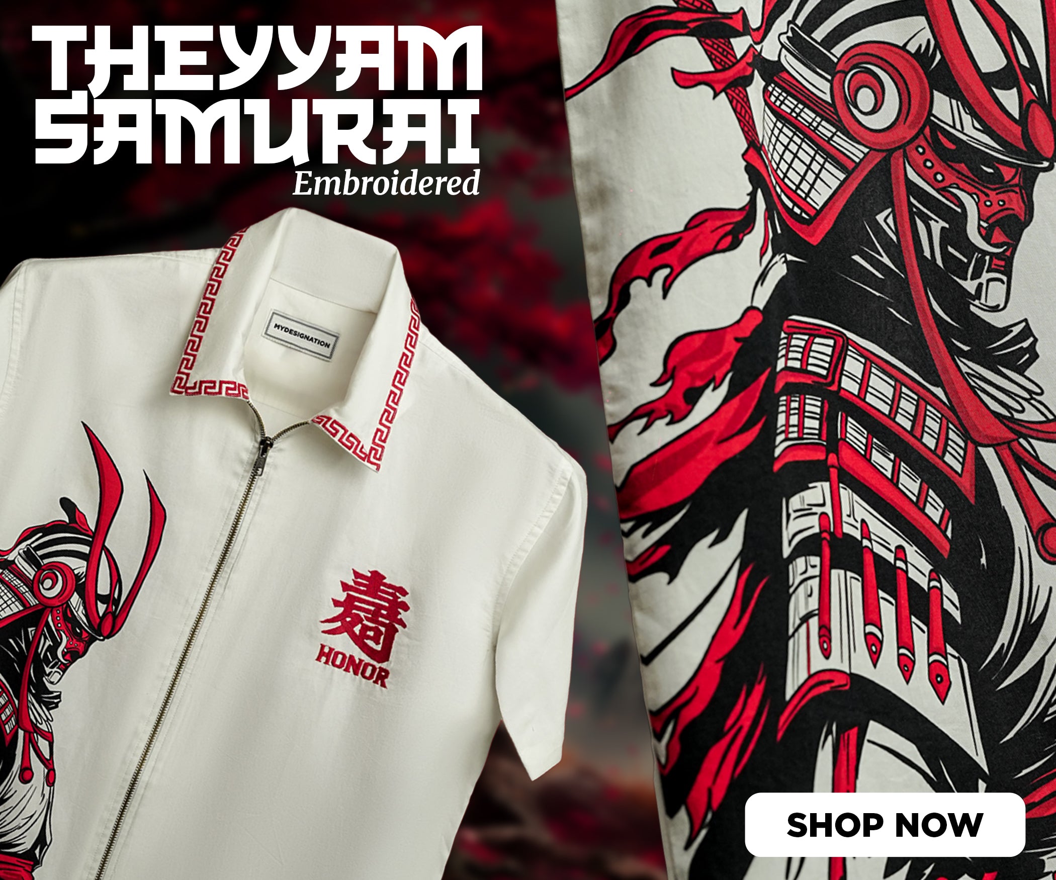 Forget what you know about jackets. The Samurai Jacket is an artistic fusion, inspired by the rich cultural heritage of Japan and China , crafted into an oversized modern bomber silhouette. Its most striking detail is the coiled red dragon on the back, its fierce form symbolizing power, protection, and transformation, a revered figure in both cultures. On the front, traditional red Chinese knot toggles replace standard buttons, paying homage to centuries old knotting techniques. Flame-like motifs run along the sleeves, a statement look that’s impossible to ignore.