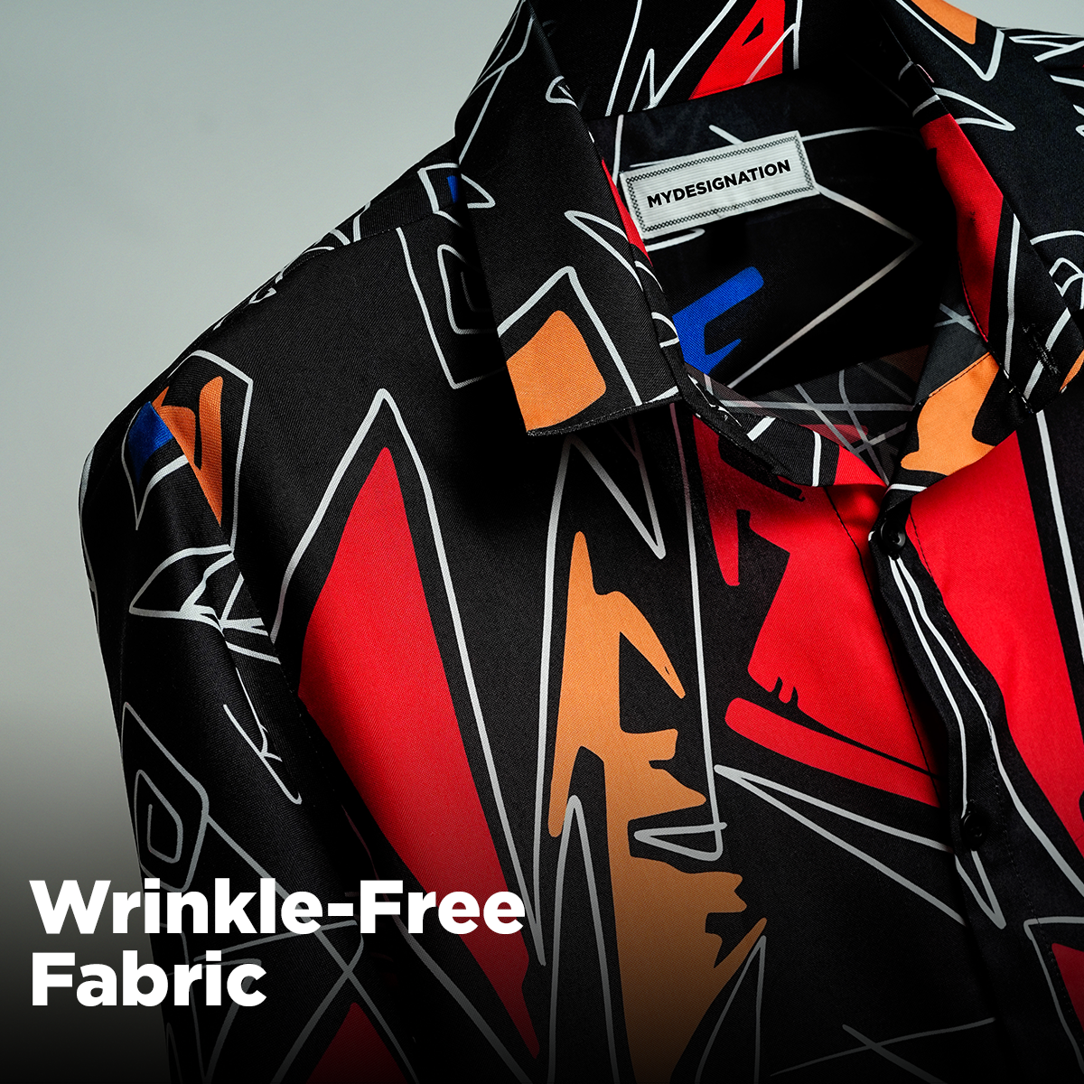 This shirt is wearable artwork with a mix of red, yellow, and blue. Loud, graphic, and full of energy. Scribbled like a sketchbook.