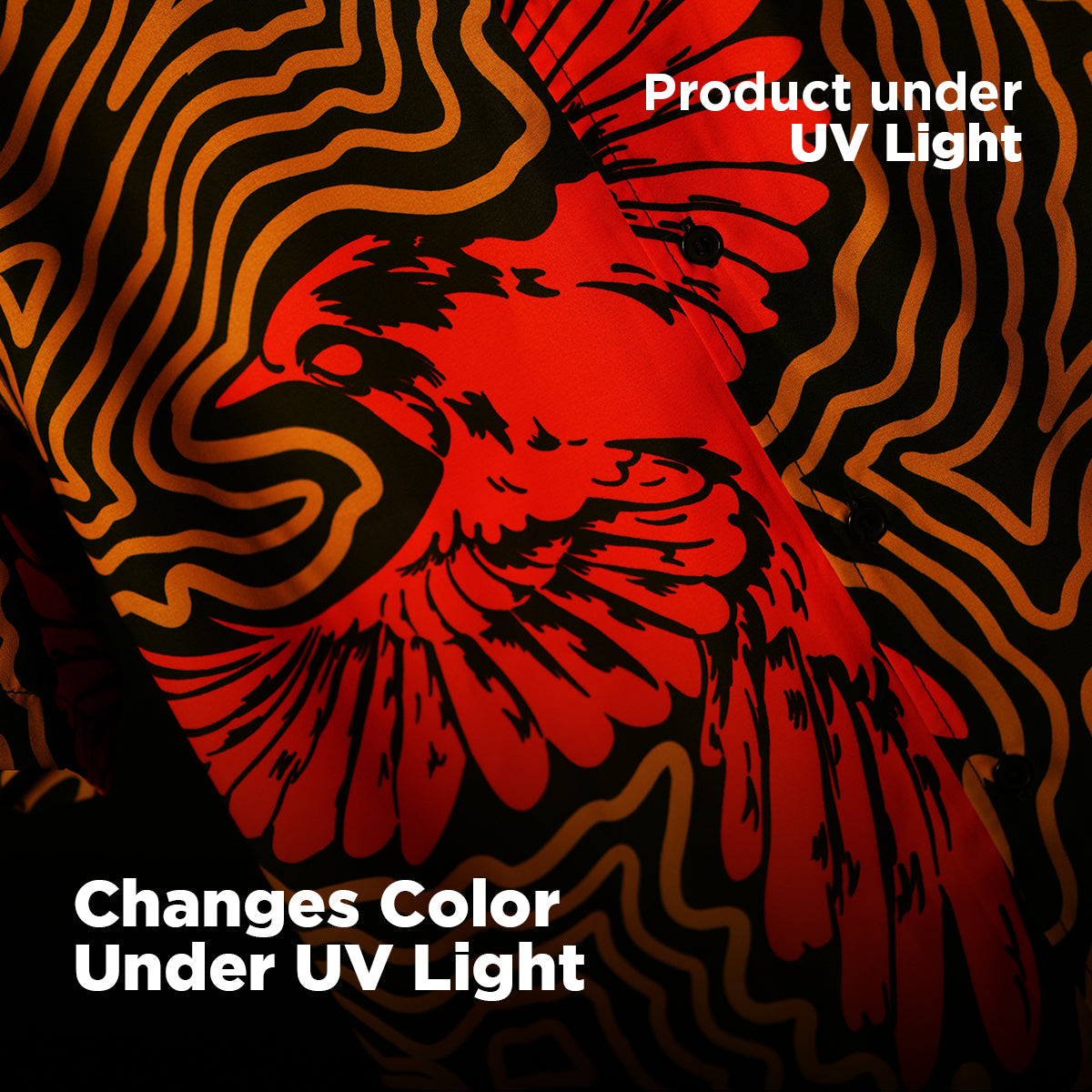 This black shirt is a fusion of art and innovation, featuring a sparrow design with an aura effect that changes color under UV light. Designed for those who shine in any crowd.