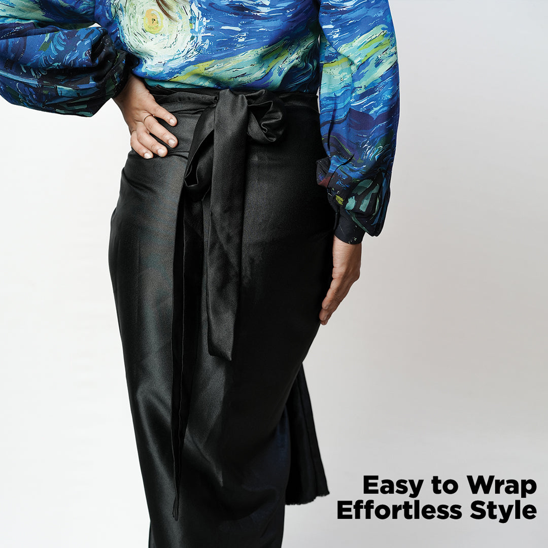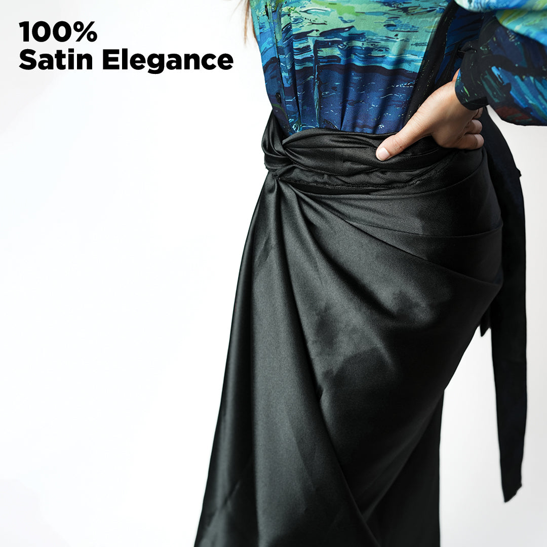 Step into luxury with the Black Satin Draped Skirt, designed with smooth satin and a versatile wrap-around style. Perfect for modern fashion lovers.