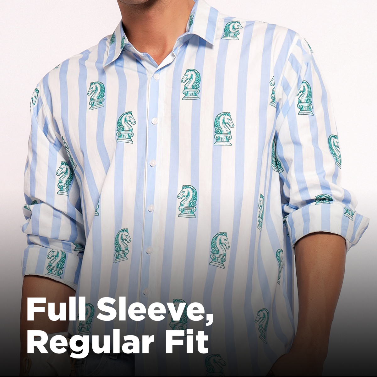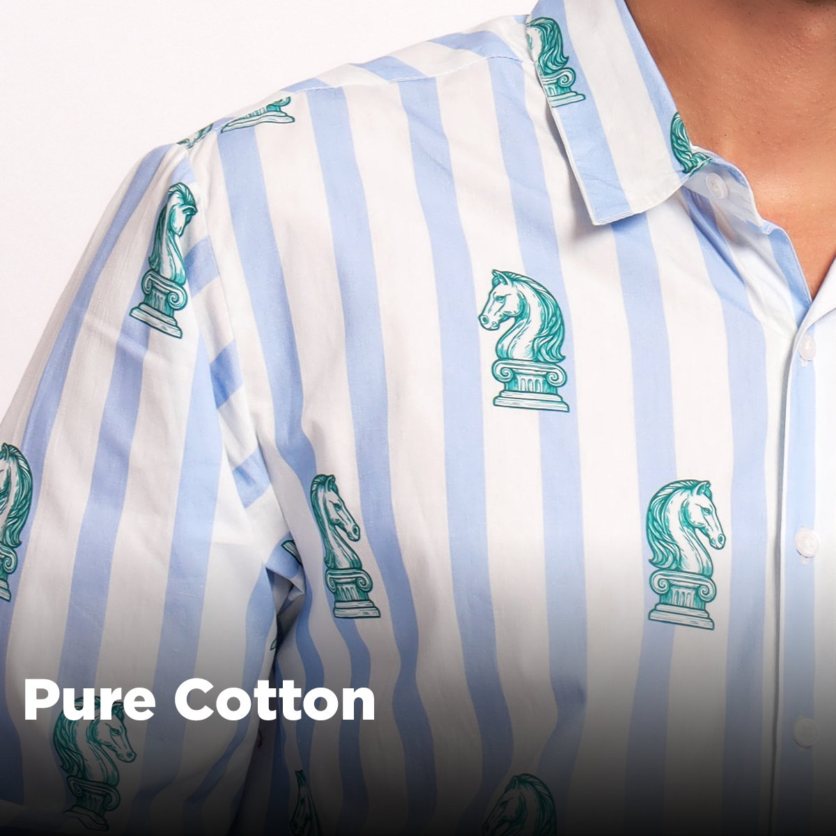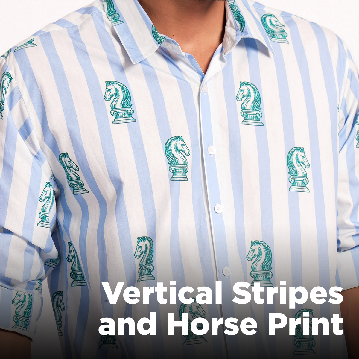 Checkmate your style game with the Chess Shirt, a white canvas layered with vertical stripes and all-over horse chess piece detailing. A statement shirt crafted for smart dressing and timeless appeal.