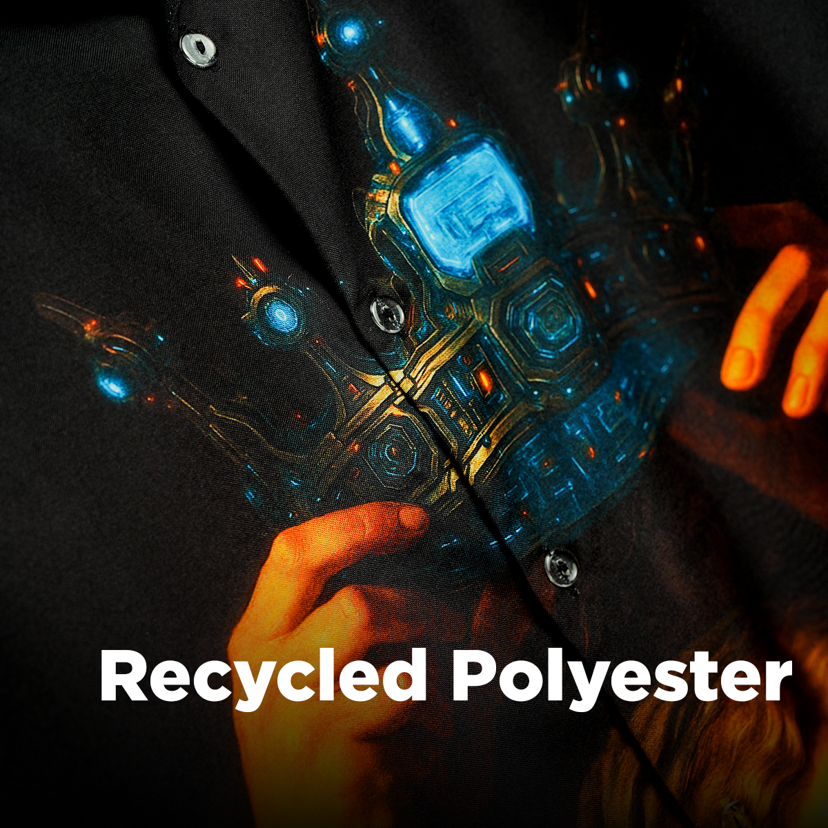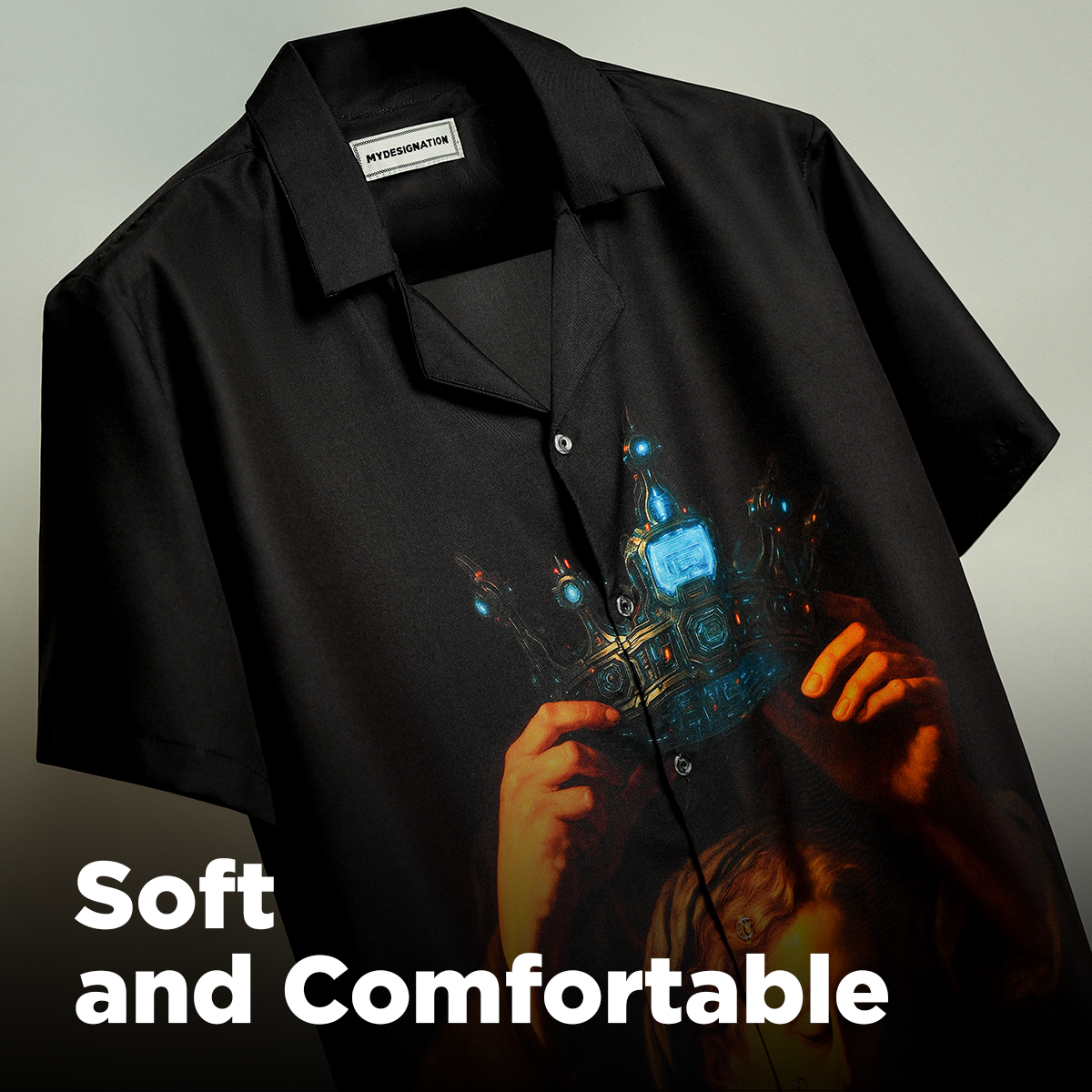 This detailed design shows a Renaissance-inspired woman being crowned, not with gold, but with a glowing futuristic crown. The beautiful contrast between the detailed painting style and the sleek, neon tech makes this shirt a unique statement piece.