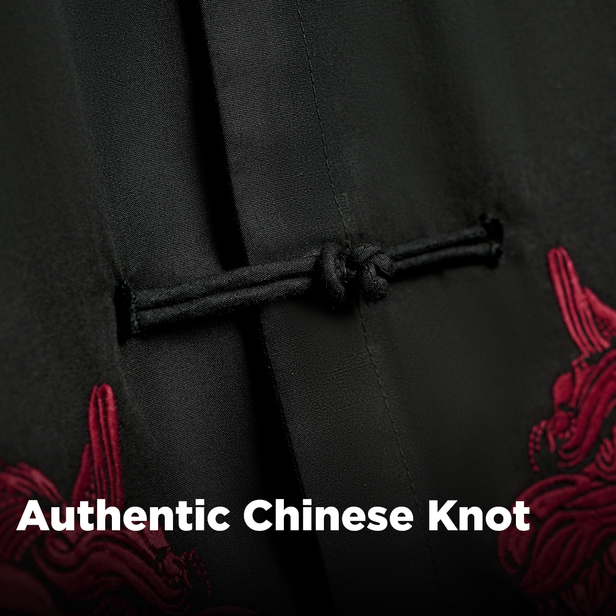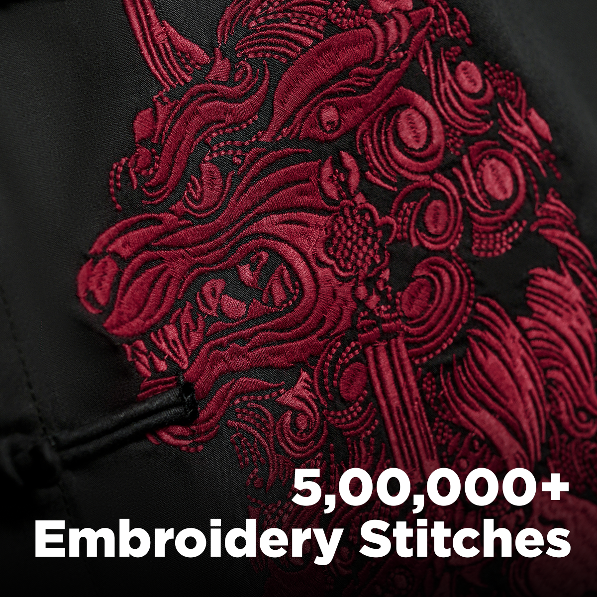 The Guardian Embroidered Shirt is defined by a Mandarin inspired silhouette, Chinese knot button fastenings, a spread collar, and refined short sleeves. Twin Foo Dogs sit in mirrored stance at the base, their bold red embroidery guarding the sleek black frame.