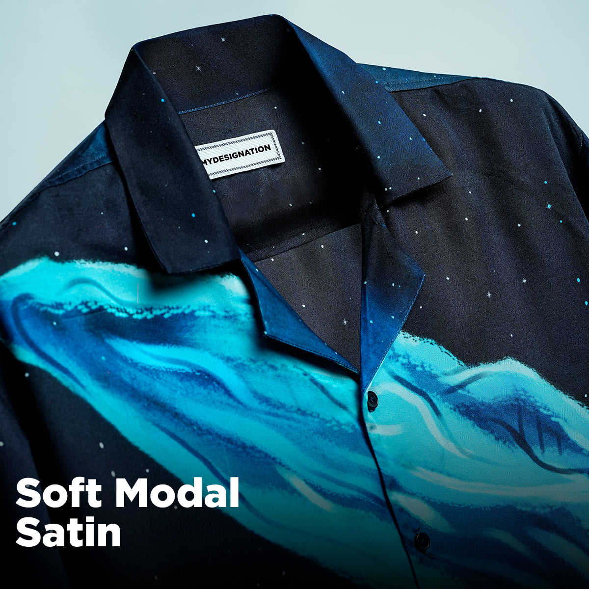 Inspired by the ocean’s mystery it's a canvas of quiet adventure. Midnight skies, shooting stars, and a neon whale rising from the deep. it’s a moment frozen in premium modal satin