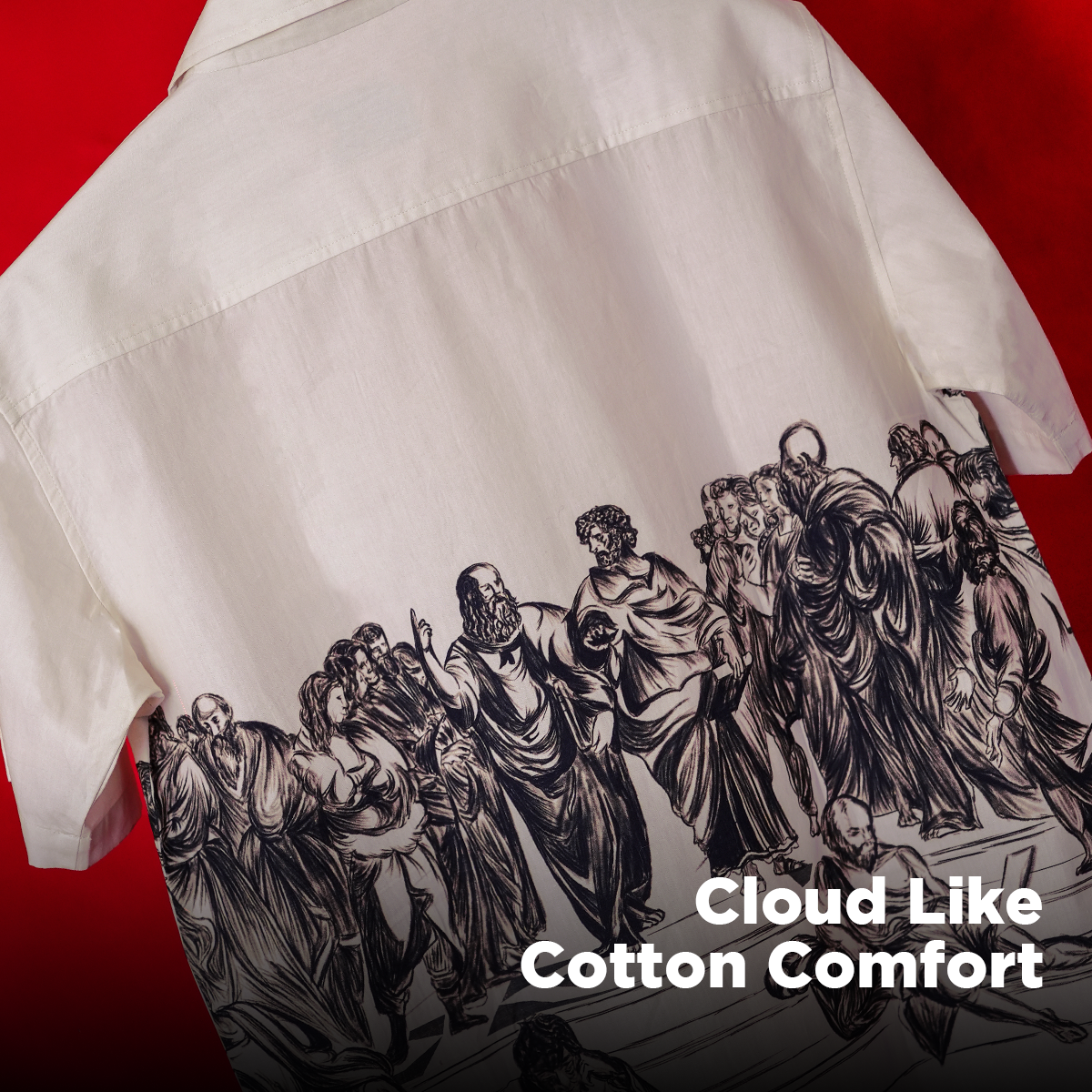 Grab the essence of Renaissance art with this off-white cotton shirt, featuring a placement print inspired by Raphael's iconic School of Athens painting.