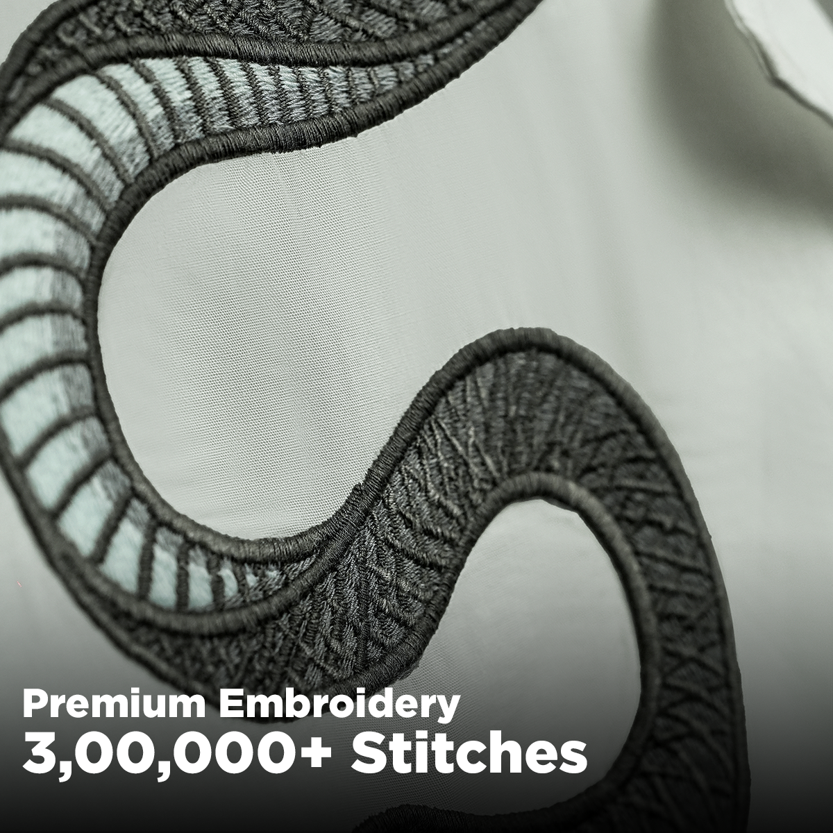 This curved double placket shirt features a striking silver snake embroidery that glides across the fabric. The subtle continuation inside the yoke makes it all the more unique.