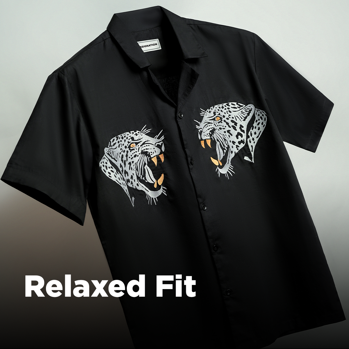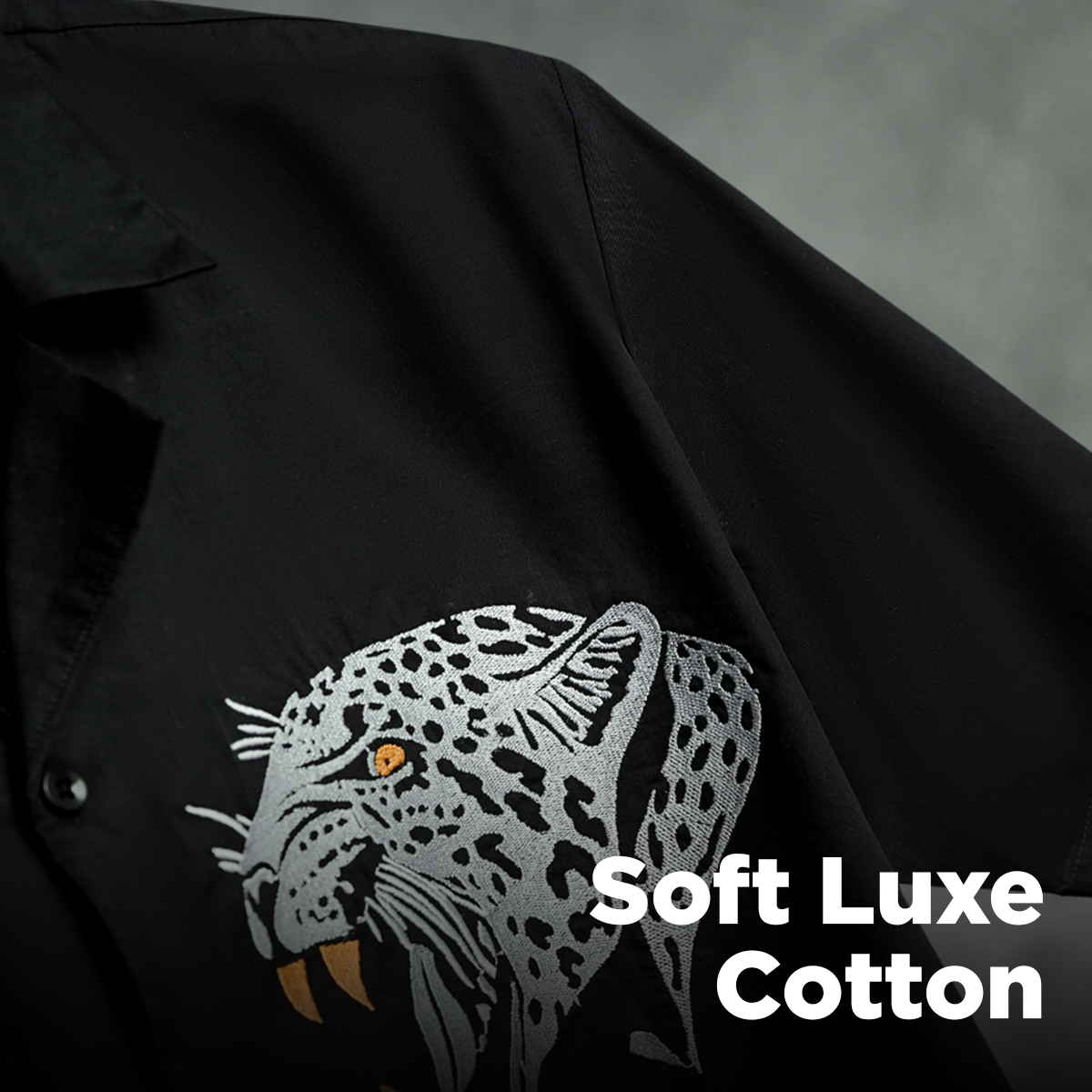 Featuring twin embroidered silver leopard heads with piercing amber fangs, this black shirt blends sleek tailoring with untamed spirit. A striking essential for the bold dresser.