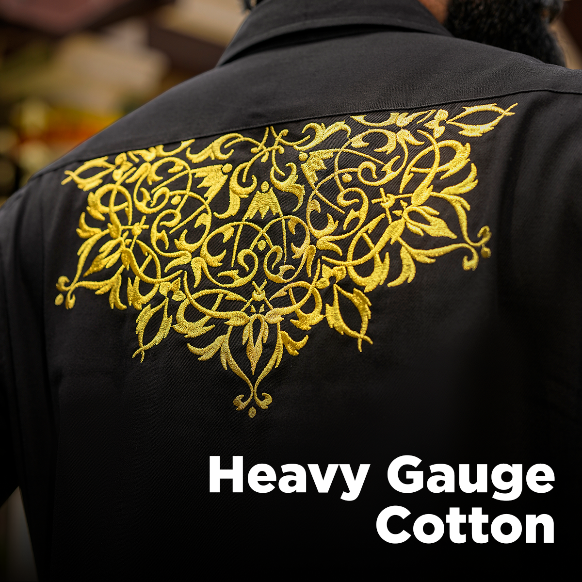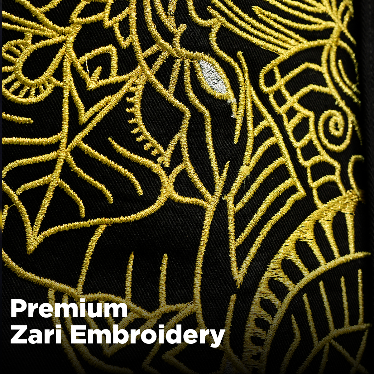 This black shirt has a shiny gold and silver elephant design on the front, made with detailed embroidery. The back has a matching pattern, giving the shirt a royal and special look.