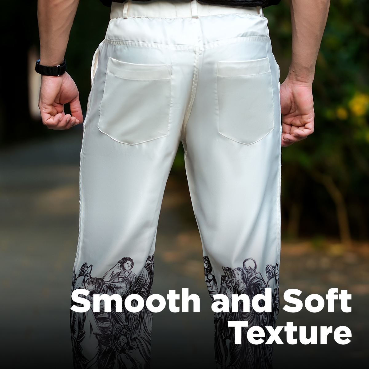 Step into a world of classic elegance with this off-white satin pants, featuring a subtle yet striking placement print inspired by Raphael’s School of Athens.