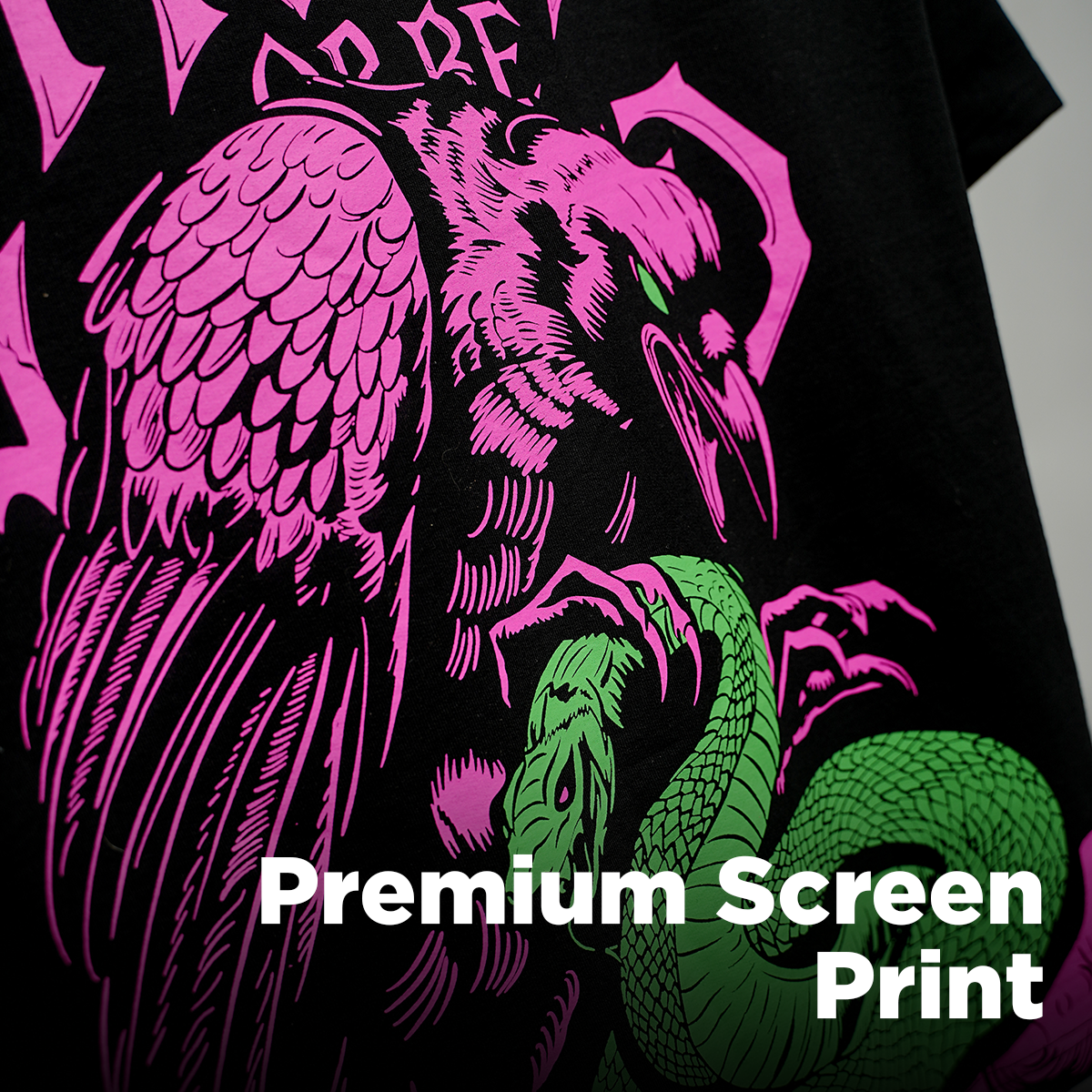 Features a striking neon illustration of a concluded battle, a raven victorious over a serpent, captured in green and pink hues. Designed in an expressive pop-art style, the artwork stretches across the front and back.