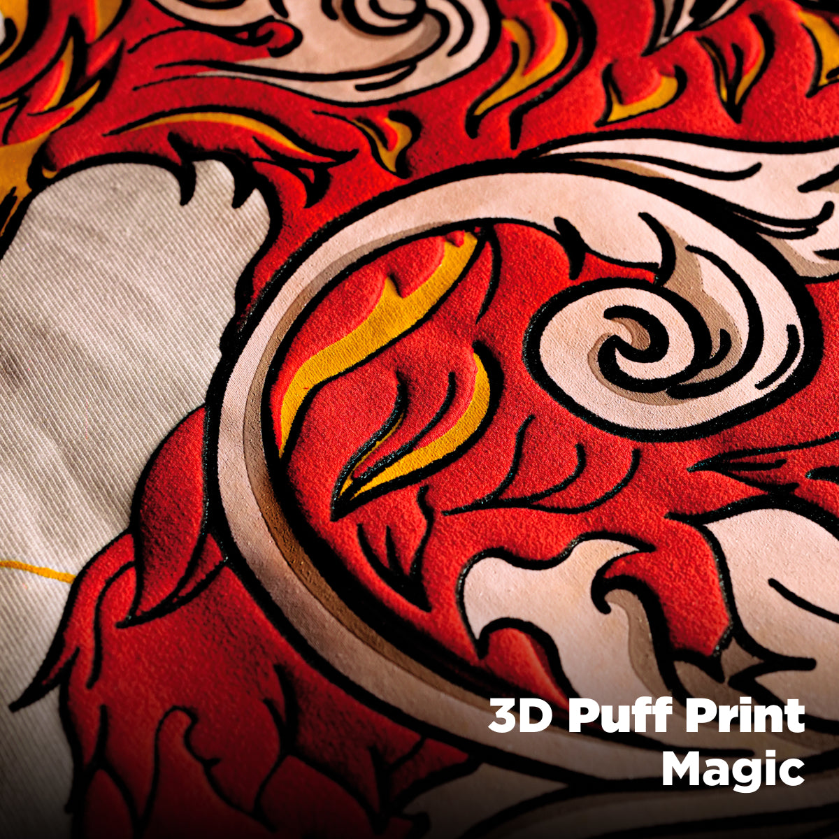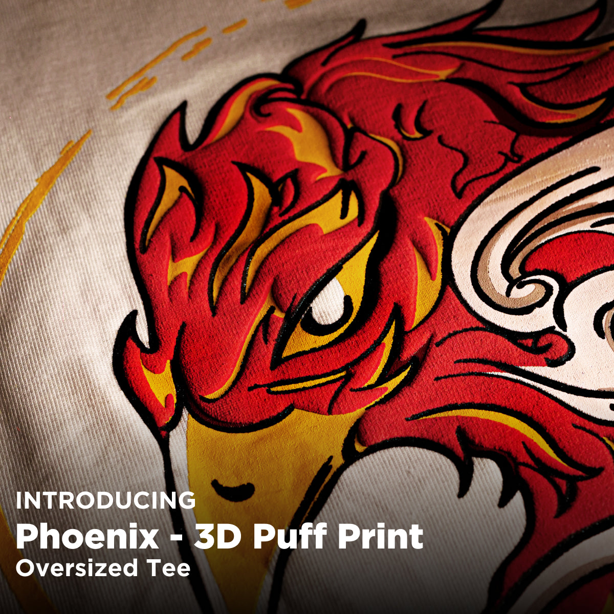 Rise above the ordinary with the Phoenix Puff Printed Oversized T-shirt. Made from premium 240 GSM heavy gauge cotton, this white tee blends comfort and style effortlessly. The 3D puff print of the majestic Phoenix adds a bold touch, symbolizing strength and renewal.