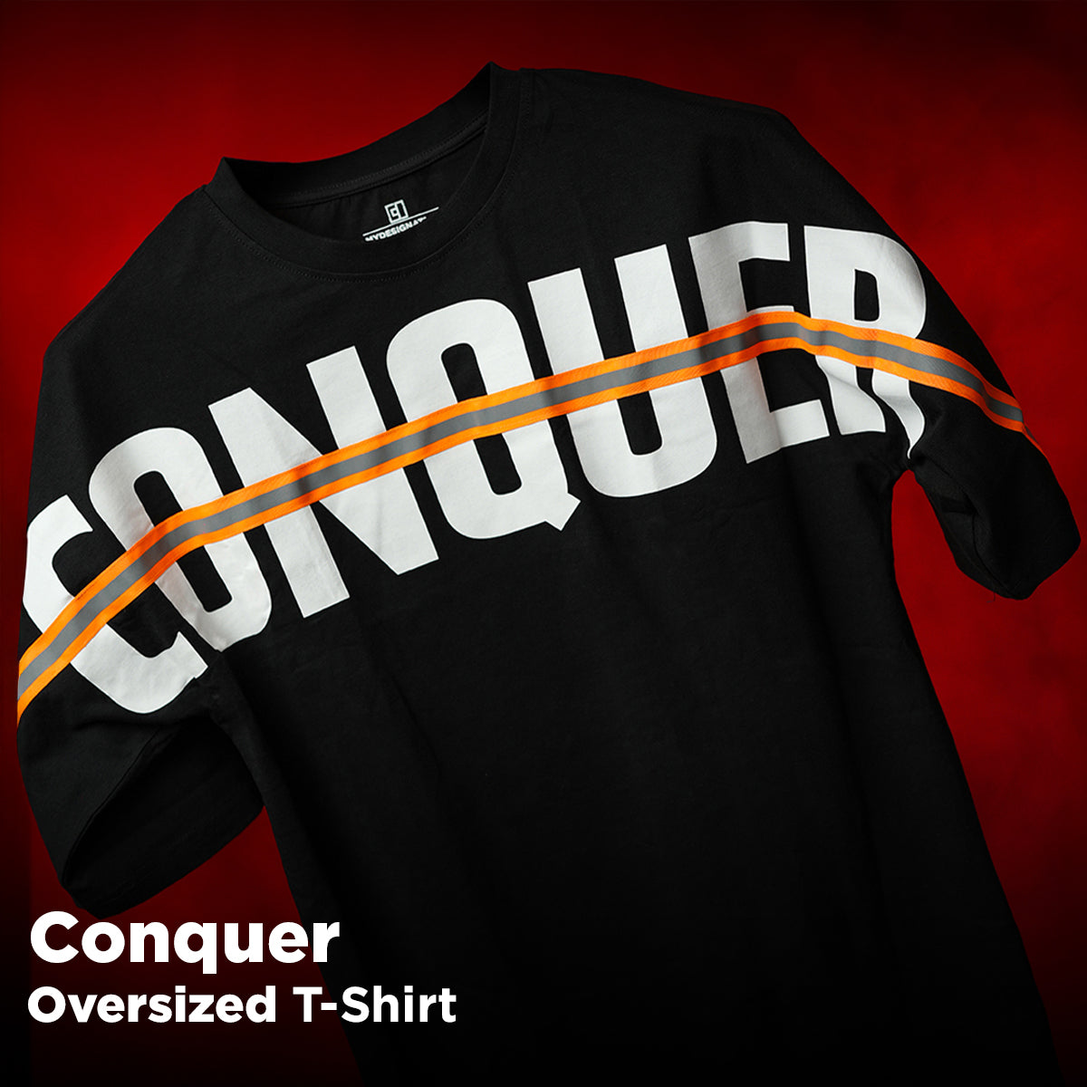 Rule the streets in style with this oversized premium cotton tee. Featuring bold 'CONQUER' lettering, a striking reflective band, and intricate back artwork, it's a statement piece for any fashion lovers