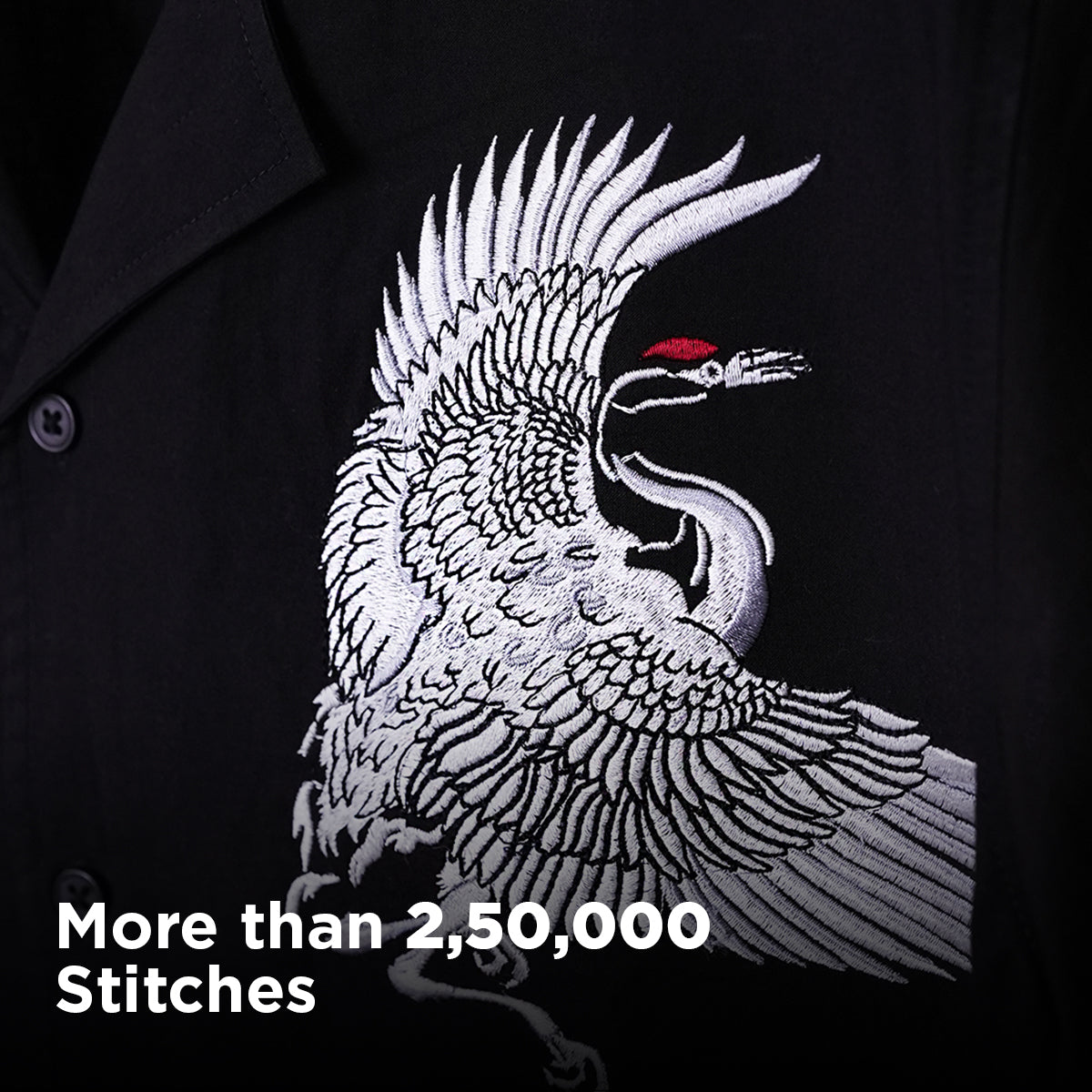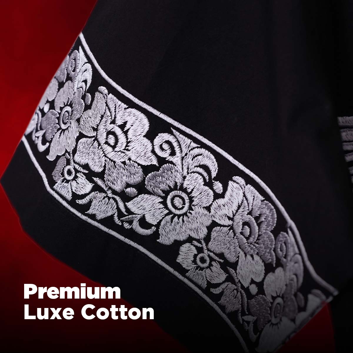 Luxury at its finest. Designed in black premium luxe cotton, this shirt features over 2,50,000 stitches of embroidery, including on the sleeves. Carefully crafted with detail, this shirt is both luxurious and cool, with a modern look.