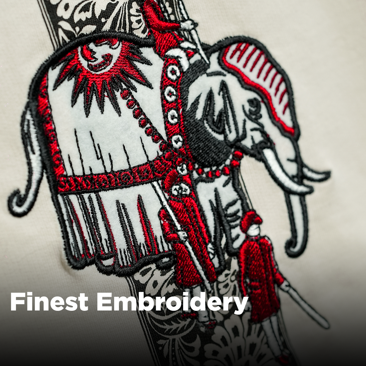Featuring a bold red-and-ivory GULREZ patch on the front, designed like a vintage postage stamp. The back showcases an embroidered, decorated elephant walking over a Mughal-style floral panel
