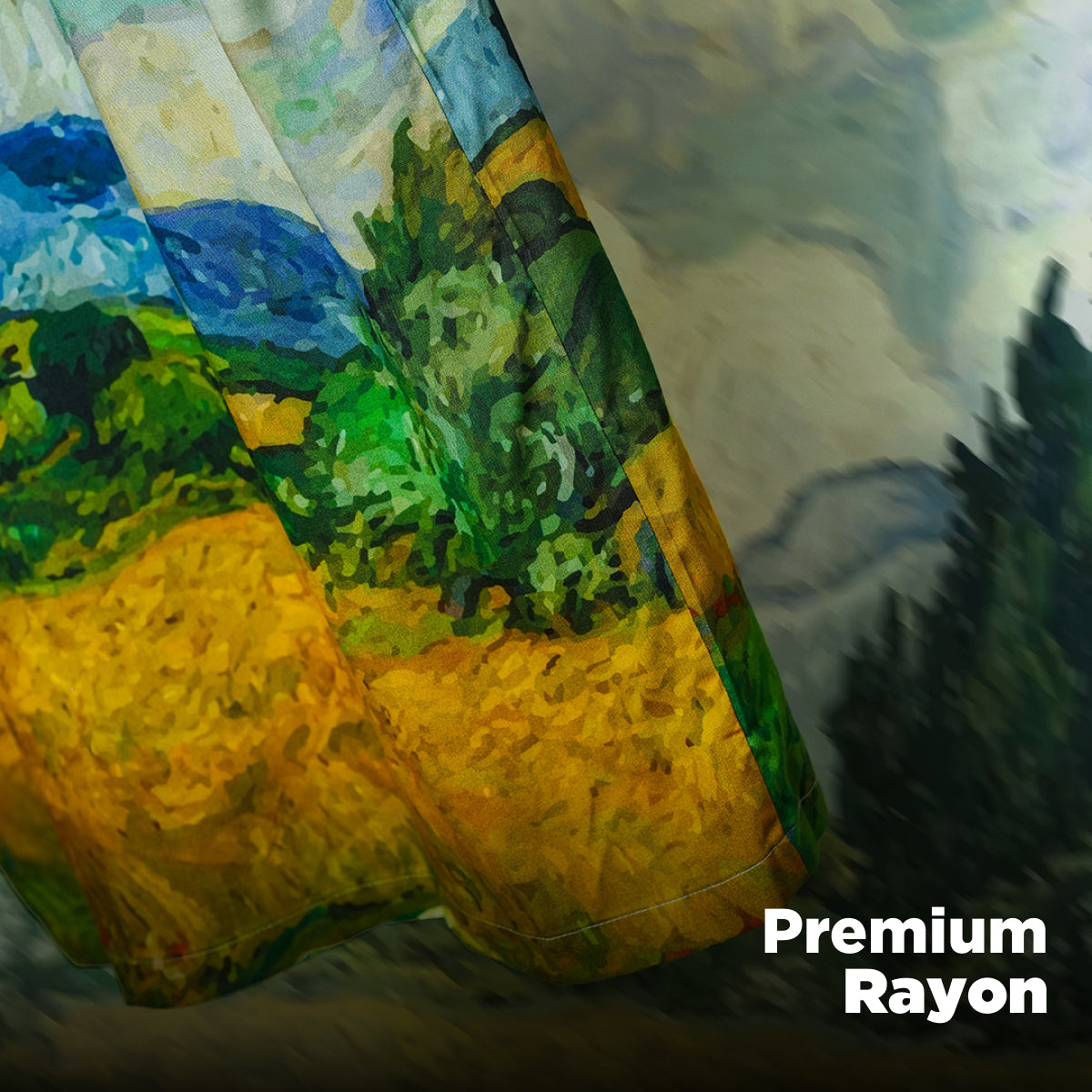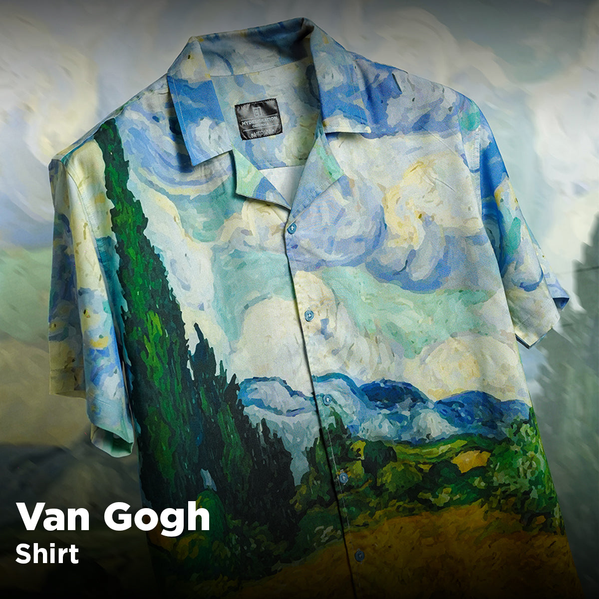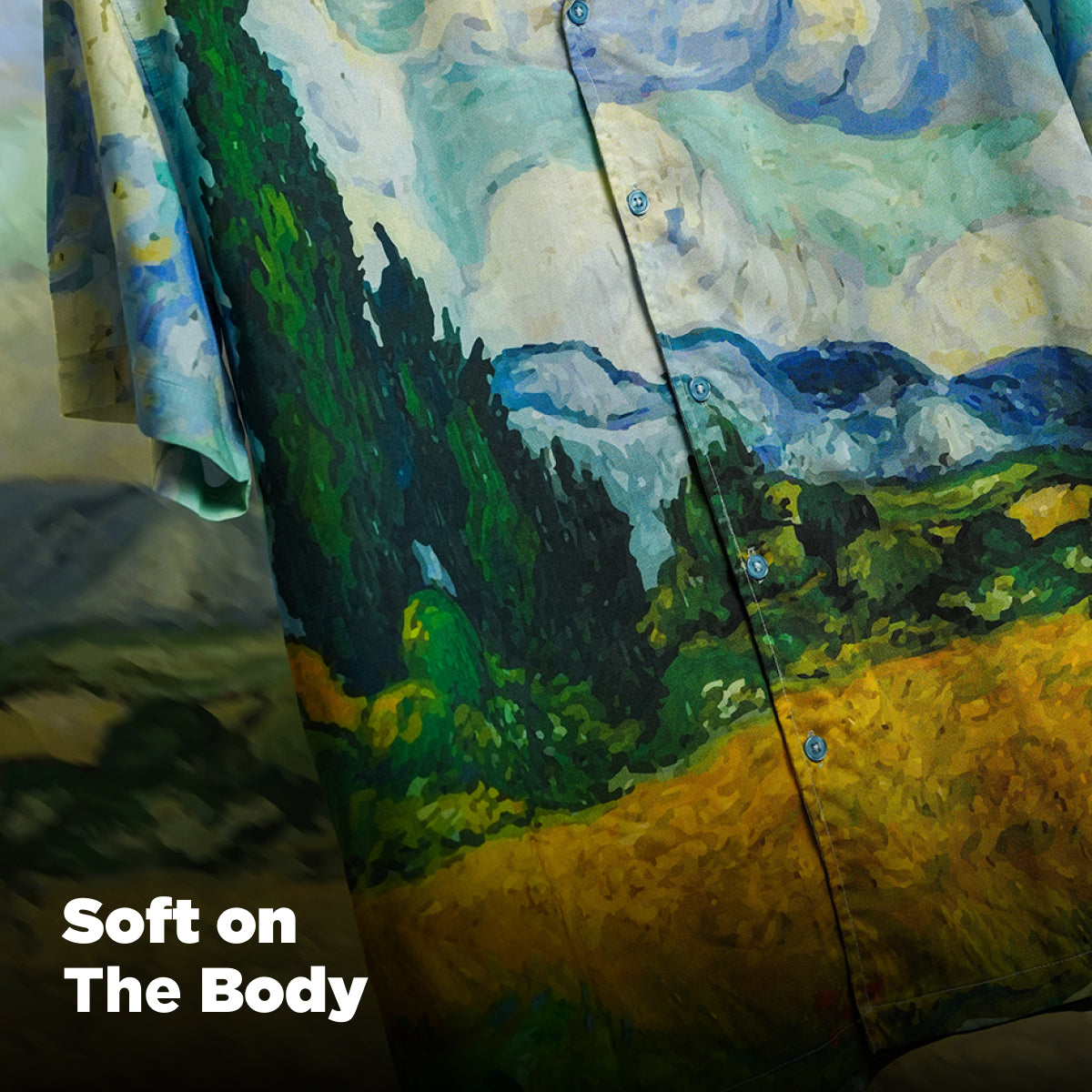 Inspired by Van Gogh’s Wheat Field with Cypresses, this multicolor shirt brings art to life with its vibrant design. The premium fit and details make it an ideal choice for those who love creative fashion.